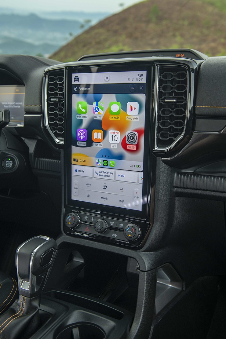 Ford Ranger 2025 đang là mẫu bán tải có màn hình sau tay lái lớn nhất phân khúc. Phanh tay điện tử cũng được làm gọn gàng và sang hơn so với loại cơ vốn khá cồng kềnh và thô như ở thế hệ trước.