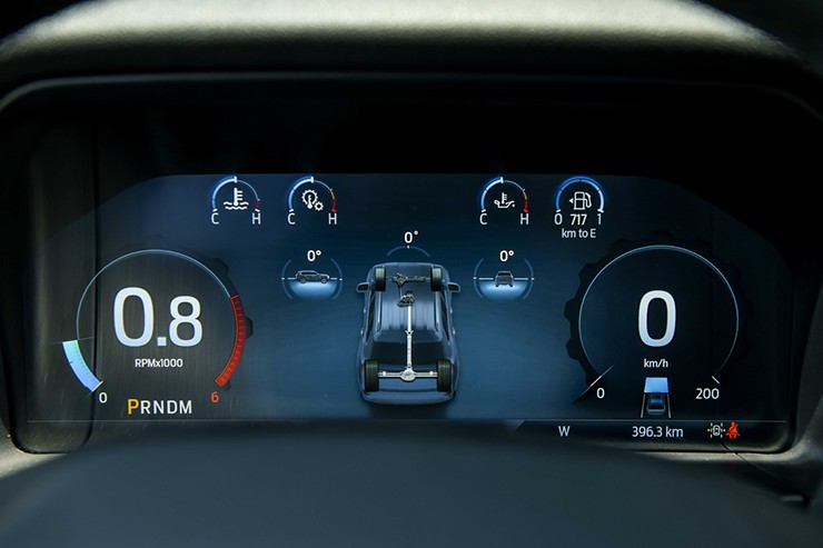 Để hỗ trợ off-road tốt hơn, Ford Everest 2026 có chế độ hiển thị dữ liệu riêng phục vụ mảng vận hành (truyền động, vi sai, góc đánh lái, góc nghiêng,...). Mẫu SUV 7 chỗ có khả năng lội nước sâu 800mm, tải trọng kéo tối đa 3.500kg. Giá gắn nóc cho phép chở thêm vật dụng cồng kềnh nặng tối đa 350kg.